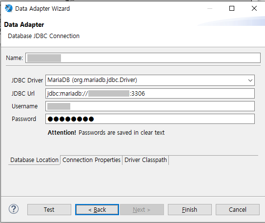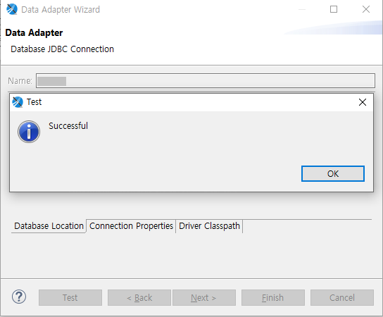 3. 다음 정보 입력 후 Test 버튼을 클릭했을 때 Successful 메시지가 뜨면 Finish 클릭