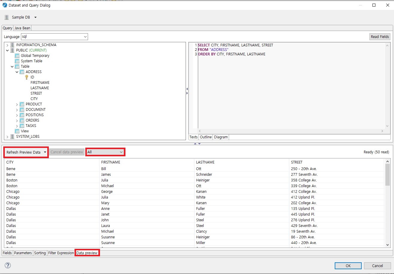 3. Data preview 탭에서 All을 선택하고 Refresh Preview Data를 클릭하면 데이터 미리 조회 가능.