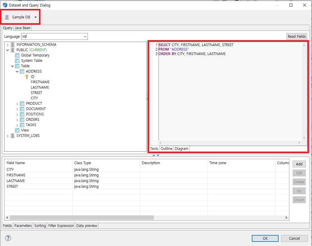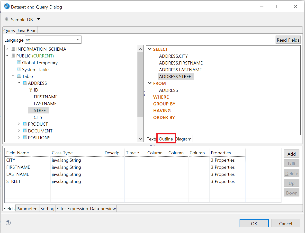 (좌측 Query 탭 > Table > ADDRESS에서 원하는 필드를 우측 Outline 탭으로 드래그하여 쿼리문을 완성할 수도 있음)