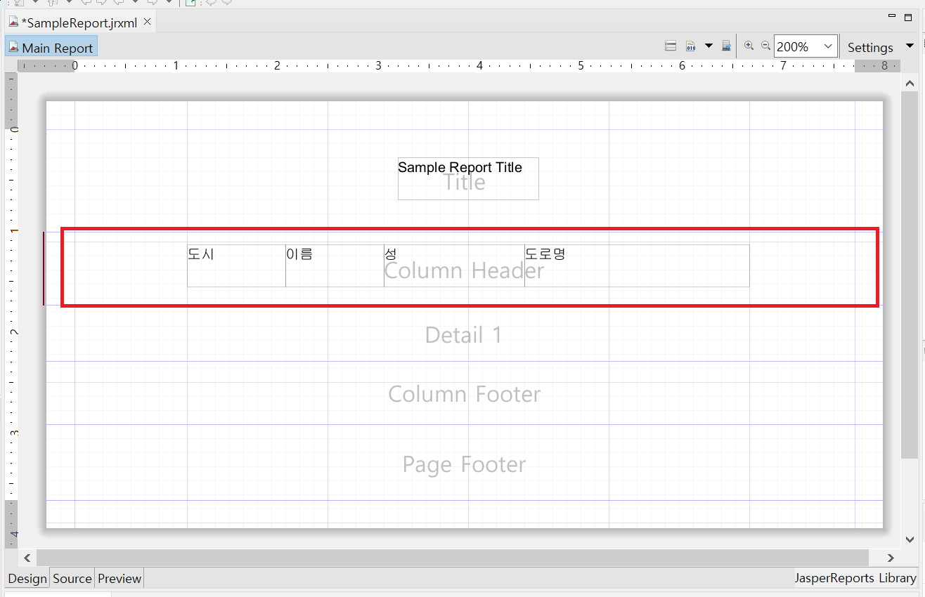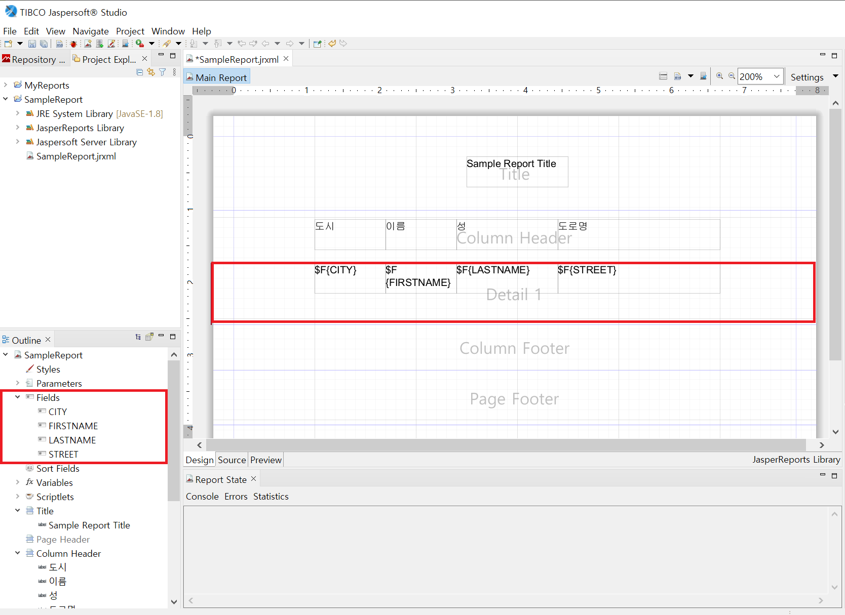 7. 좌측 하단 Outline 뷰 > SampleReport> Fields에서 필드를 선택하여 Detail Band로 드래그하여 필드 추가.