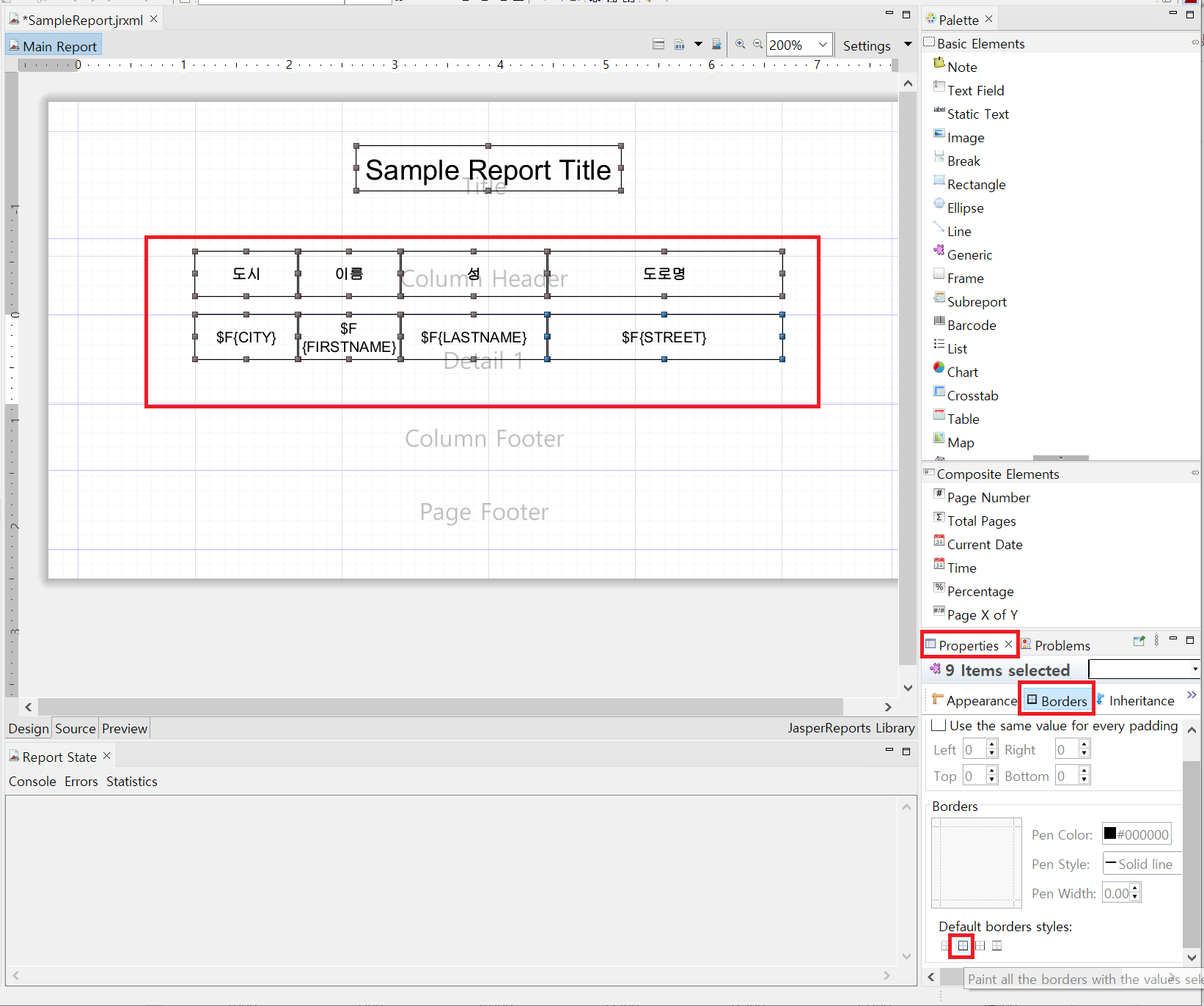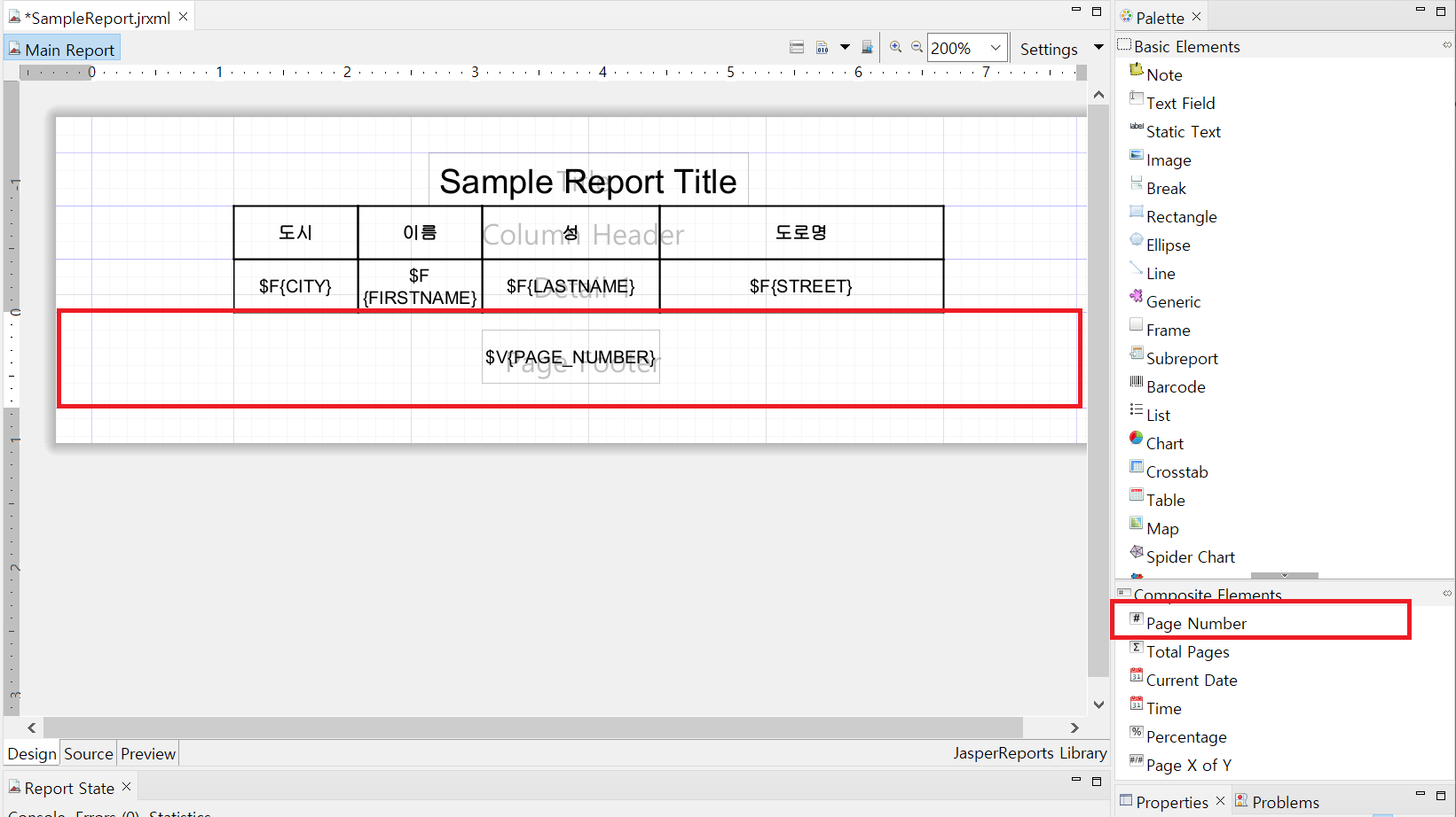 11. 우측 Palette 뷰 > Composite Elements에서 Page Number를 Page Footer로 드래그하여 추가