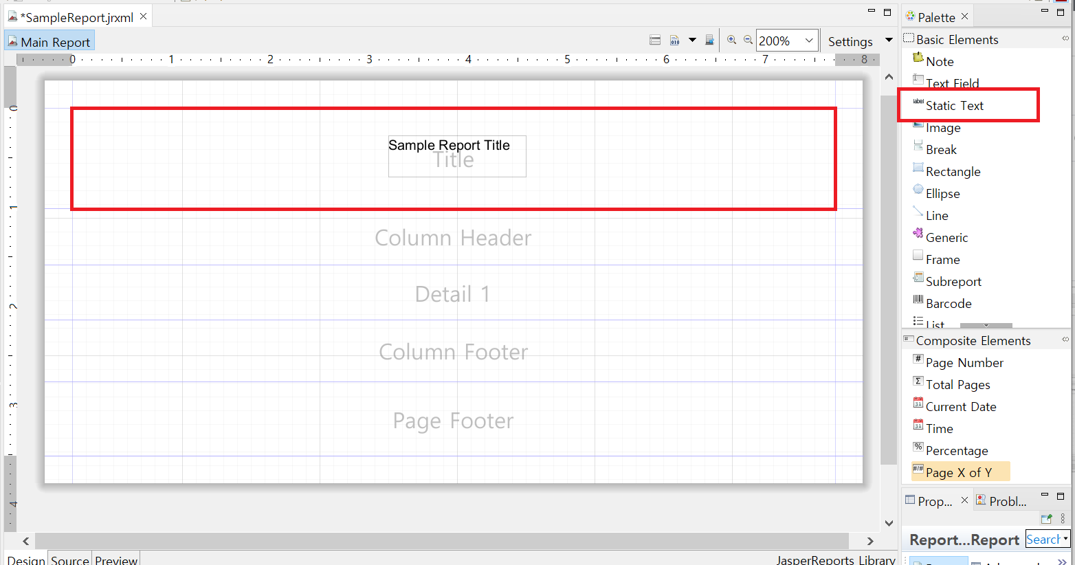 5. 우측 Palette 뷰에서 Static Text를 Title Band에 드래그하여 보고서 제목 추가