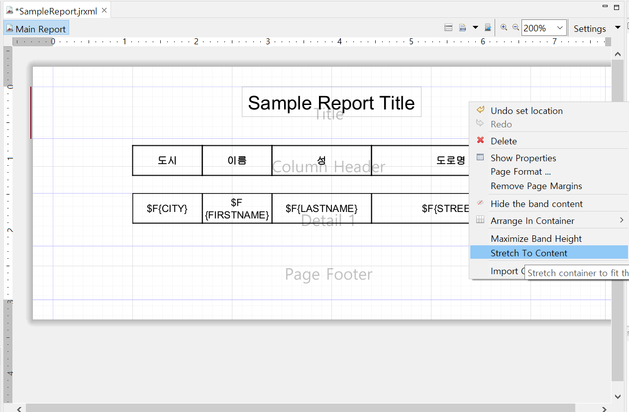 10. 보고서 제목을 Title Band 맨 위쪽 라인에 맞추고 Band에 우클릭 후 Stretch To Content로 Band를 클릭