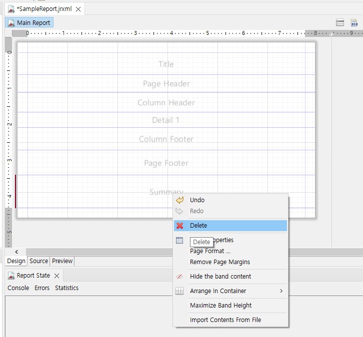 4. 필요한 Band (Title, Column Header, Detail, Page Footer)를 제외하고 삭제할 Band 우클릭 후 Delete 클릭